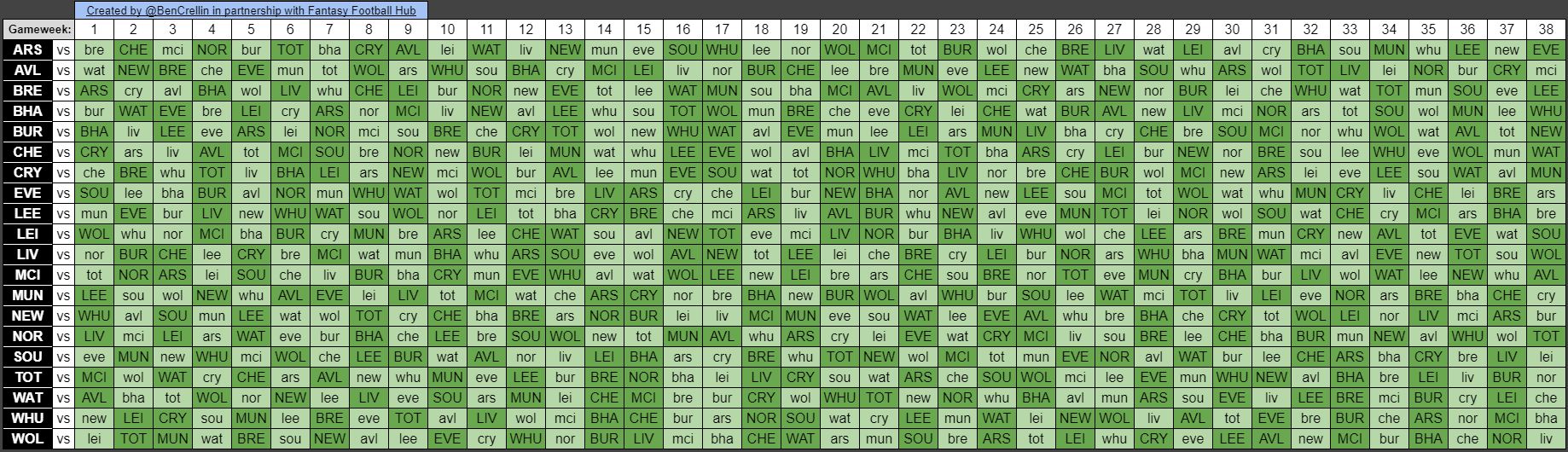 Ben Crellin En Twitter Here Are The Fixtures For The 2021 22 Fantasy Premier League Season Key Darker Green Uppercase Home Game Lighter Green Lowercase Away Game Https T Co Wxcbsmvsyd